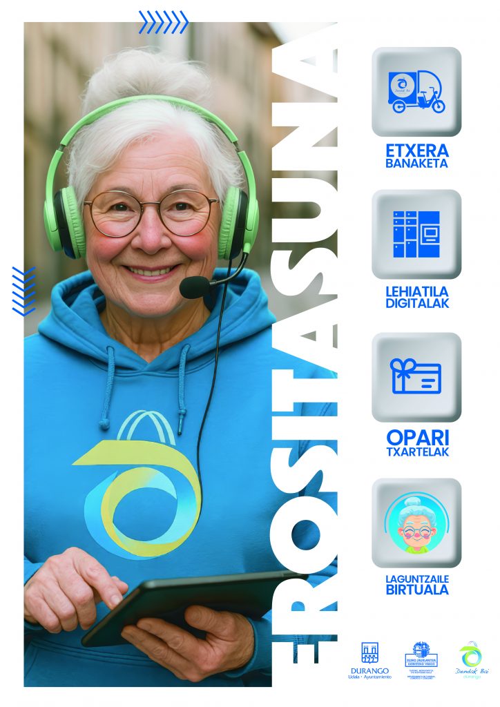 Durangoko Dendak Bai merkatari elkartearentzako EROSITASUNA izeneko kanpaina sortu dugu. Kanpainaren ardatza, merkatari elkarteak erosleei herrian erosteko ematen dizkien erraztasunak dira, jada sortua duten AMARI izeneko laguntzaile birtual batean pertsonifikatuta. Adimen Artifizialaren laguntzaz, abatare birtualean oinarrituriko pertsonaia sortu dugu, sortuko ditugun euskarri edo baliabide desberdinetan erabiltzeko asmoz.